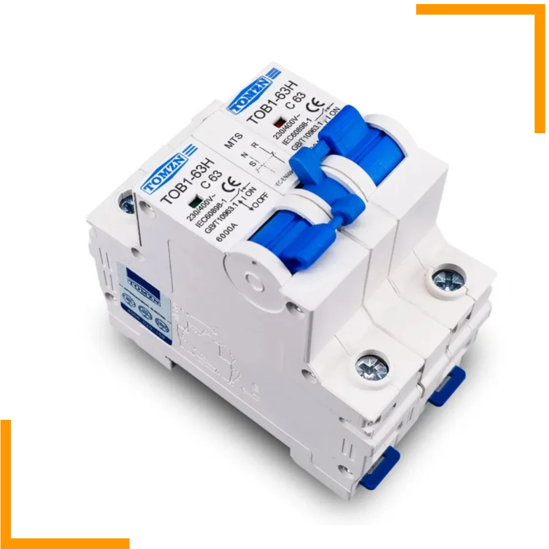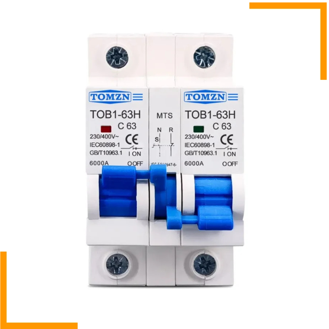 Dual Power Capability: 1P+1P MTS Interlocking 63A Tomzn, AC dual power manual transfer switch allows for seamless switching between two power sources, ensuring uninterrupted operation in case of power outages or grid failures.